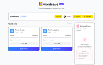 WordSave is een handige Chrome-extensie die gebruikers helpt om interessante zinnen vast te leggen terwijl ze online browsen. Met deze extensie kunnen gebruikers eenvoudig zinnen markeren en opslaan als persoonlijke flashcards, waardoor het leren van nieuwe woorden en zinnen toegankelijker wordt. De extensie stelt gebruikers in staat om door te gaan met lezen zonder hun flow te onderbreken, en biedt een gestructureerde manier om opgeslagen zinnen te bekijken en te organiseren in de WordSave-app.